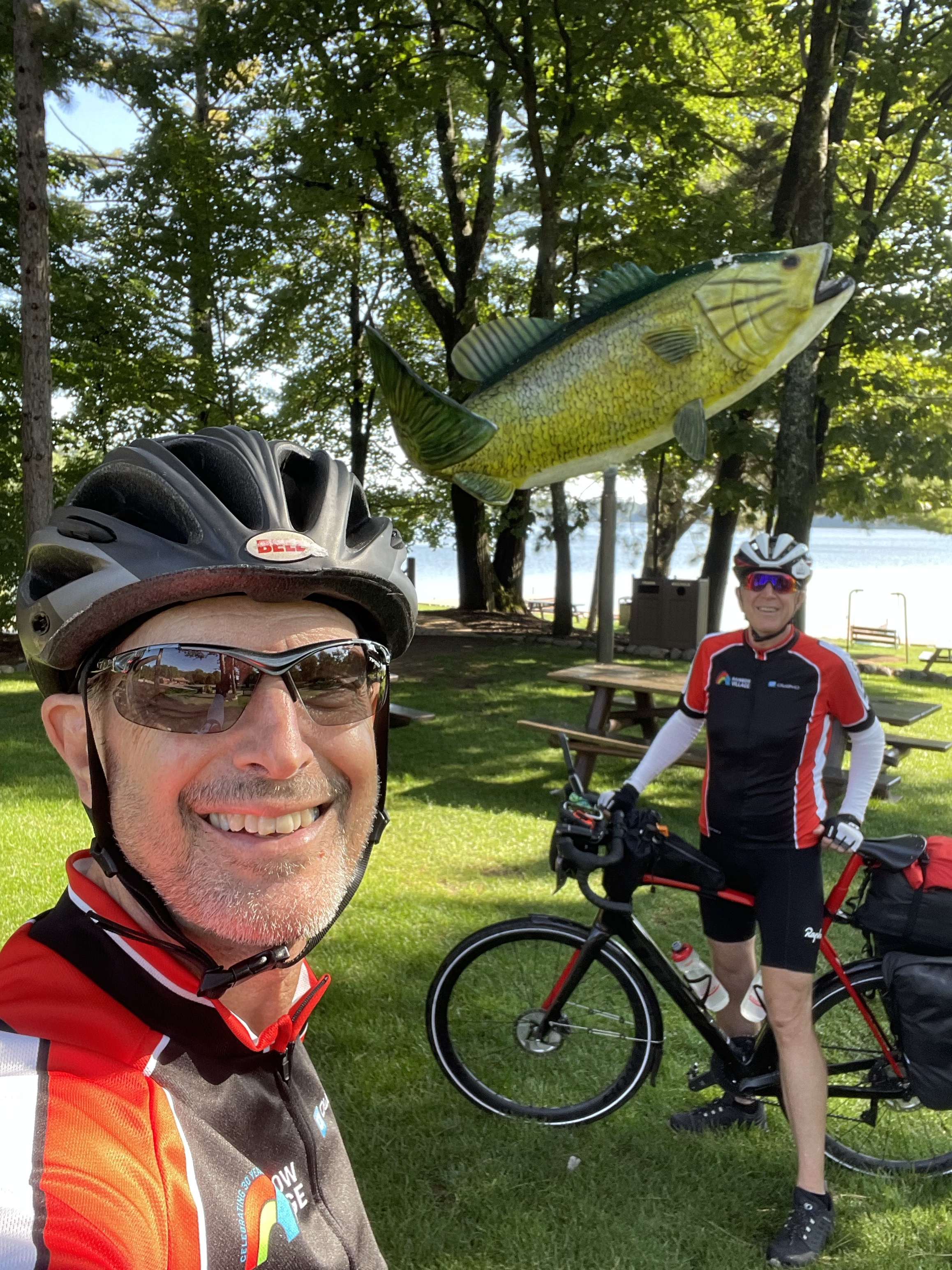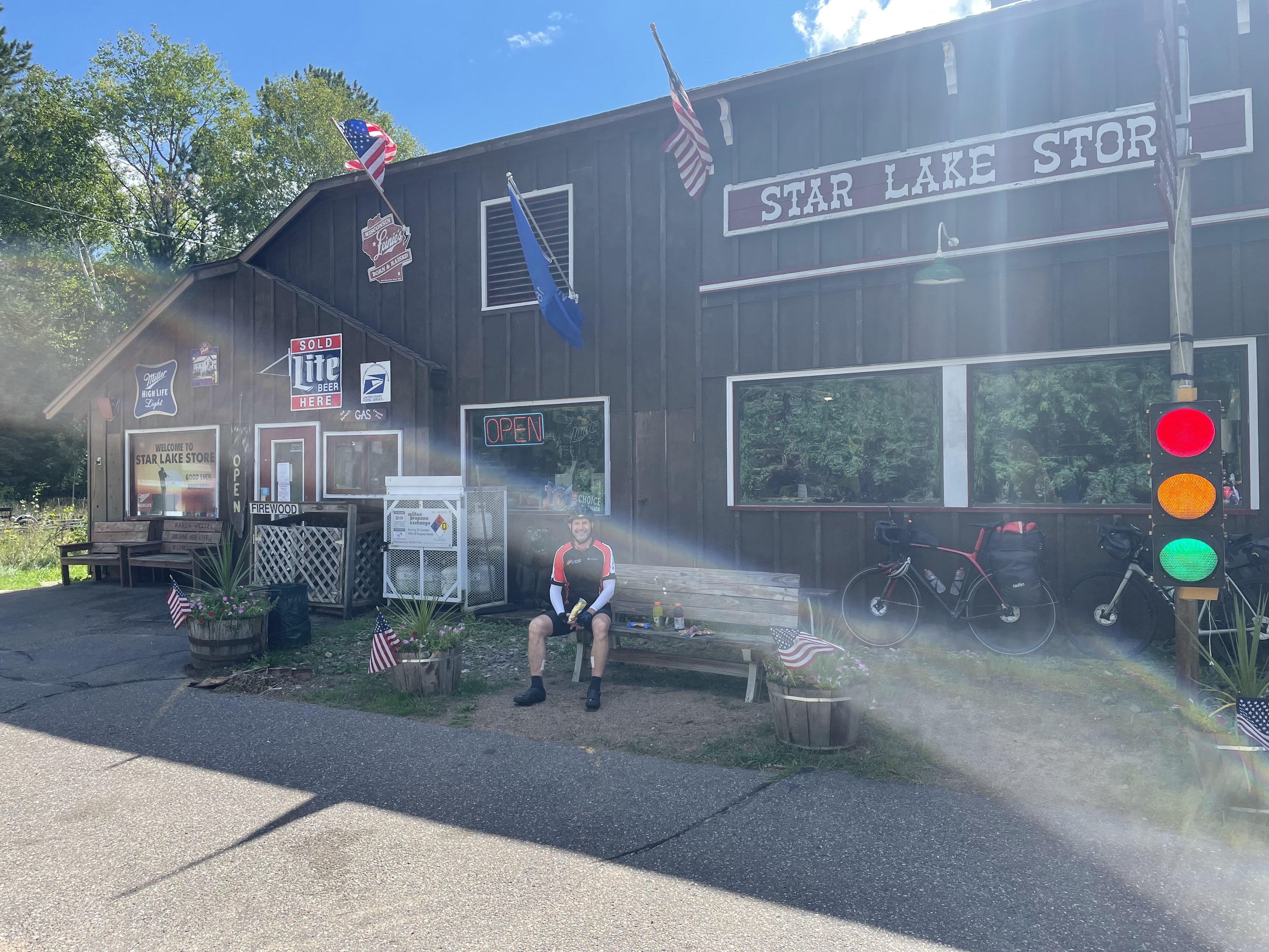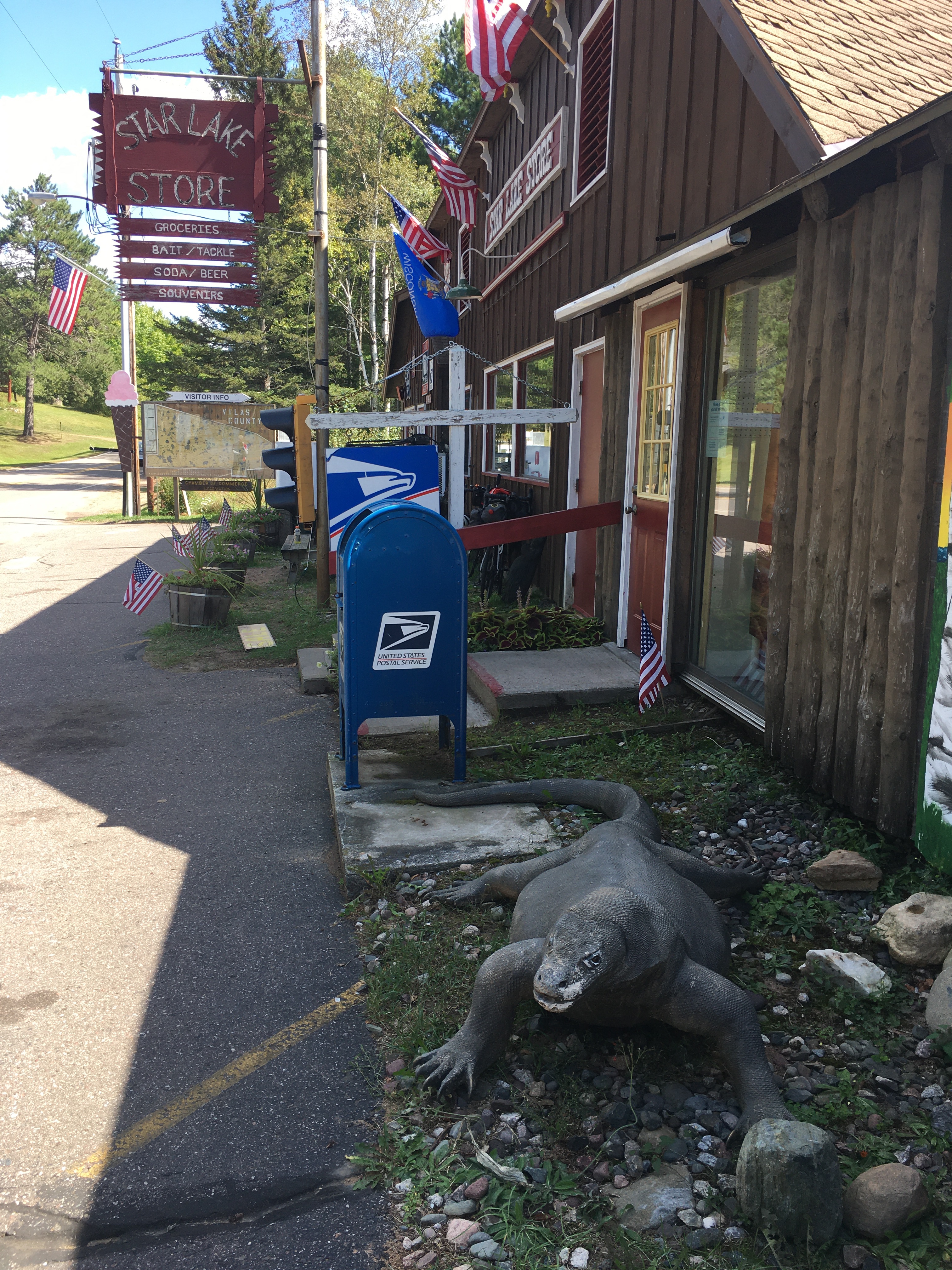 The second story is about the new owner of the Stars Lake Chamber of Commerce, visitor center, grocery store, bait and tackle shop, post office, town historian, and soon to be art gallery and cafe. I’m probably missing something else! We stopped there for lunch and started having a conversation with him and he showed us pictures from 1907 when the area around there was booming as a logging town he had other pictures from the 1930s when it was a resort town where people would come during the summer before air conditioning and take a luxury train up and spend the whole summer in cabins on the lakes up there. He is also trying to reclaim the legend of the Hodag https://en.m.wikipedia.org/wiki/Hodag that was stolen by Rhinelander but he claims originated from a taxidermist in stars lake. We enjoyed our lunch and time in Stars Lake before we had to get back on the road.
