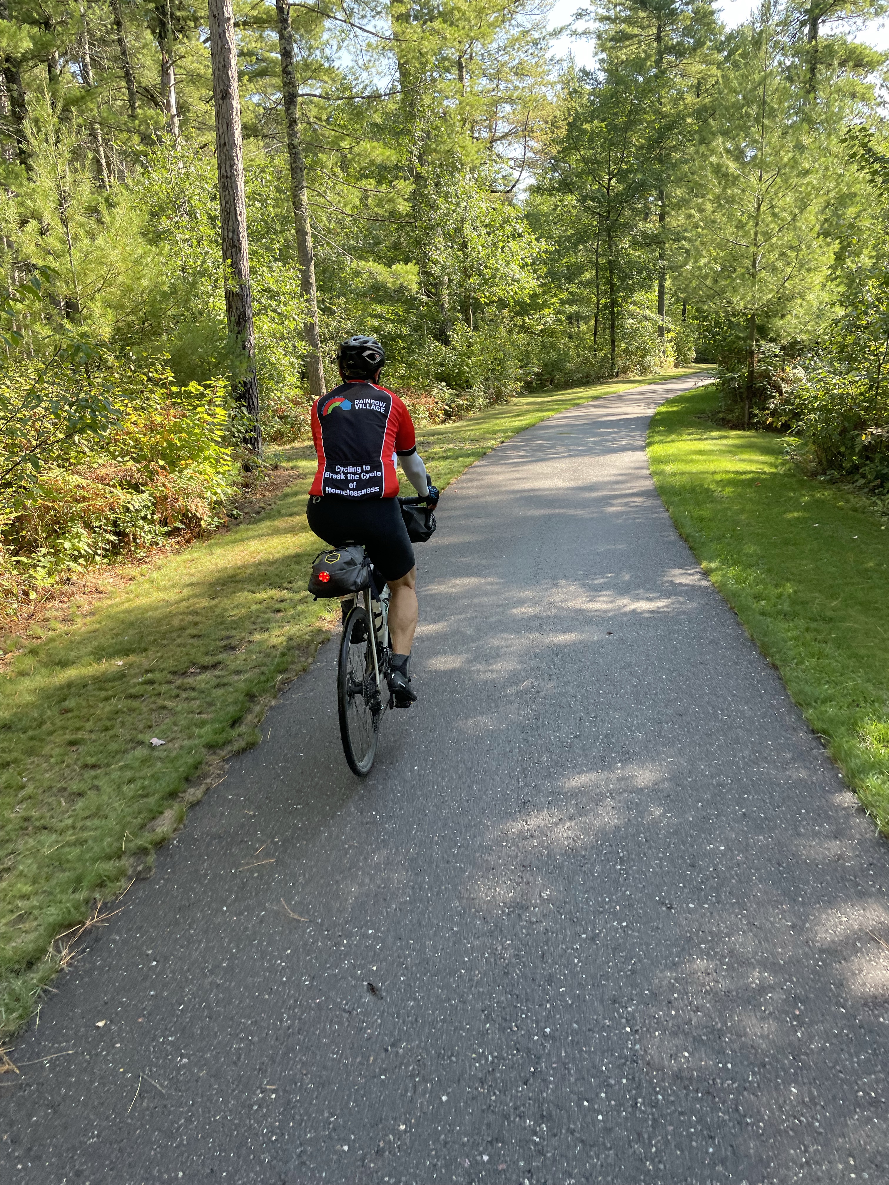 Two separate stories today. First, the most gorgeous, beautifully groomed, smooth, well maintained bike path I’ve ever seen in the middle of nowhere. If this was someone’s pork barrel project and I benefited from it is that what privilege is? The bike path is 50 miles long in the middle of nowhere perfectly smooth with groomed grass borders. It was not just laid out along an old rail path that was perfectly straight, it wound its way through the woods over creeks and streams. Along one stream crossing where there was a wooden rail there were potted geranium plants and my brother and I thought we had seen everything until 10 miles down the path we see a maintenance vehicle coming towards us that we thought was towing a mower but they were towing a leaf blower to blow any leaves off of the path. We don’t know why the path was there but we thoroughly enjoyed our time riding along it.
