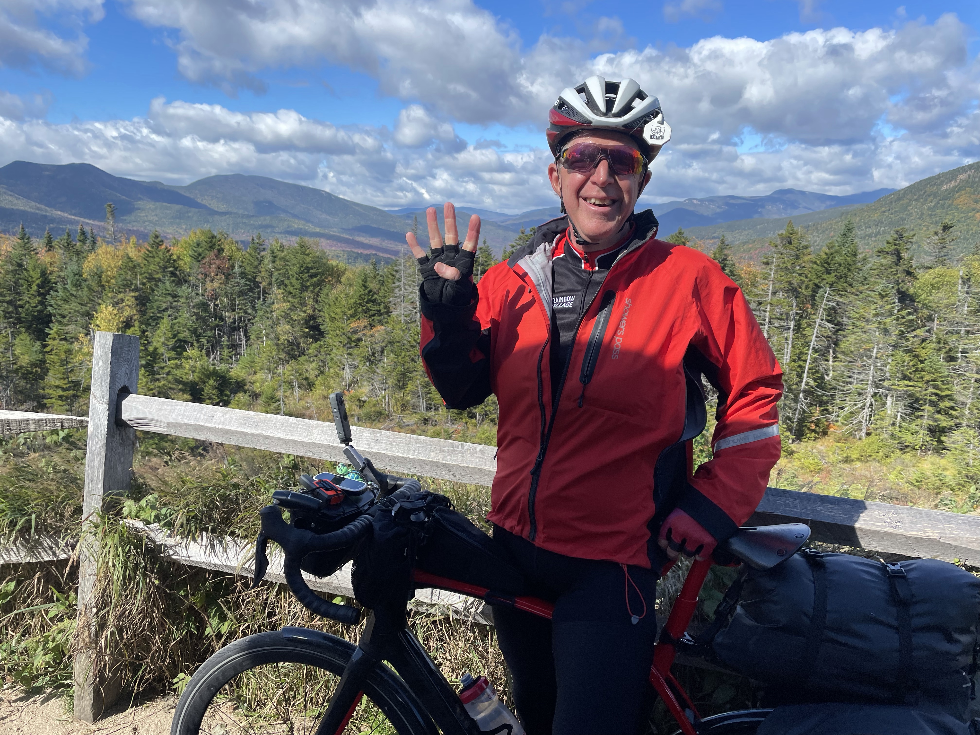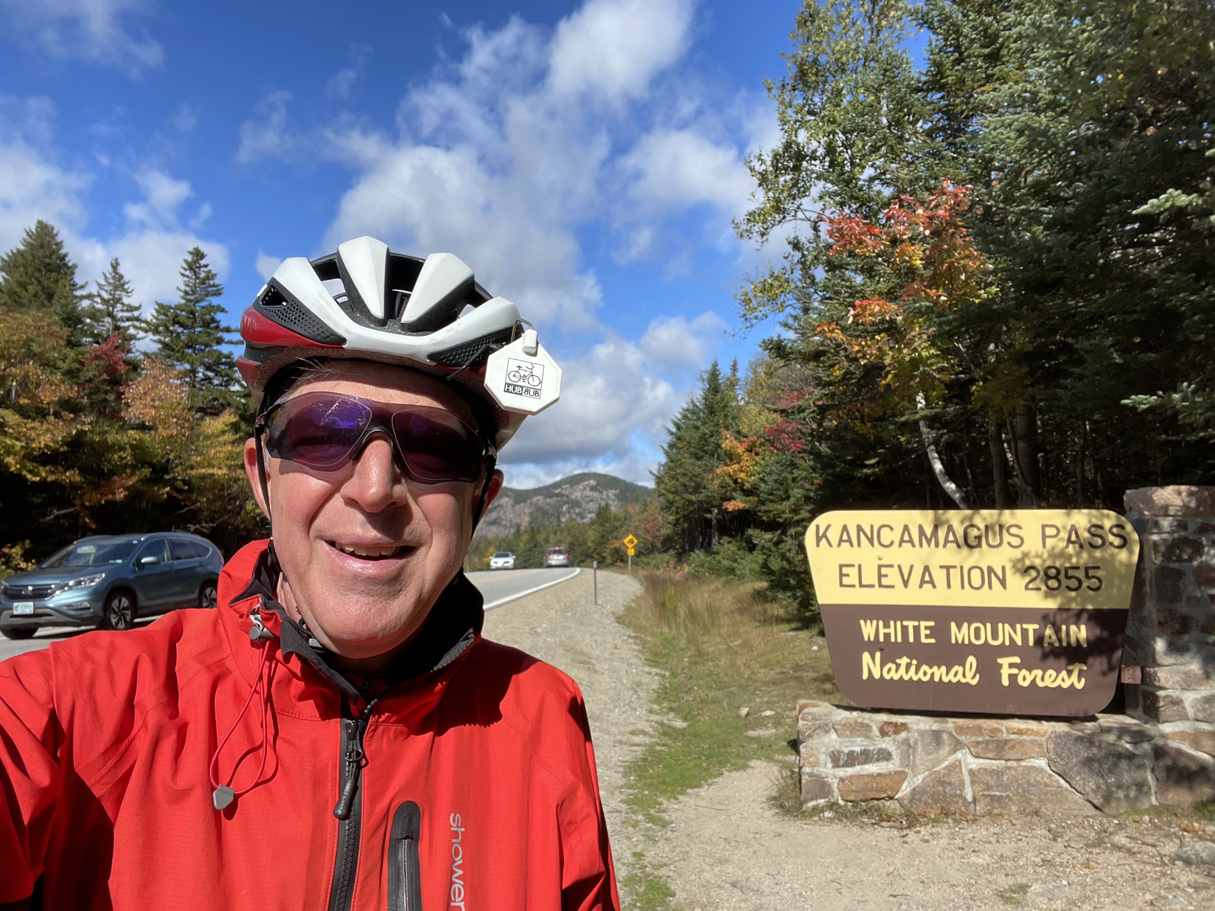 I started the day with a great breakfast at Arnold’s Wayside diner in Lincoln New Hampshire and an energetic discussion among the locals on how to pronounce Kancamagus and Pemigewasset. And, the day only got better from there! I had a beautiful ride up the Kancamagus pass with lots of scenic overlooks providing amazing views of the white mountains and fall foliage. I stopped so many times to take pictures that I was debating if I would ever get to the top. In addition to the pictures the other benefit was I kept bumping into the same couple from Evansville Indiana at every stop and we struck up a nice conversation and laughed at our repeated encounters. I reached my 4000 mile smilestone today at the peak of the climb. And, at the end of the ride I was met by my lovely wife 😀. She will have the opportunity to visit with her college roommate for a couple of days and then join me for end of ride celebrations in Bar Harbor.